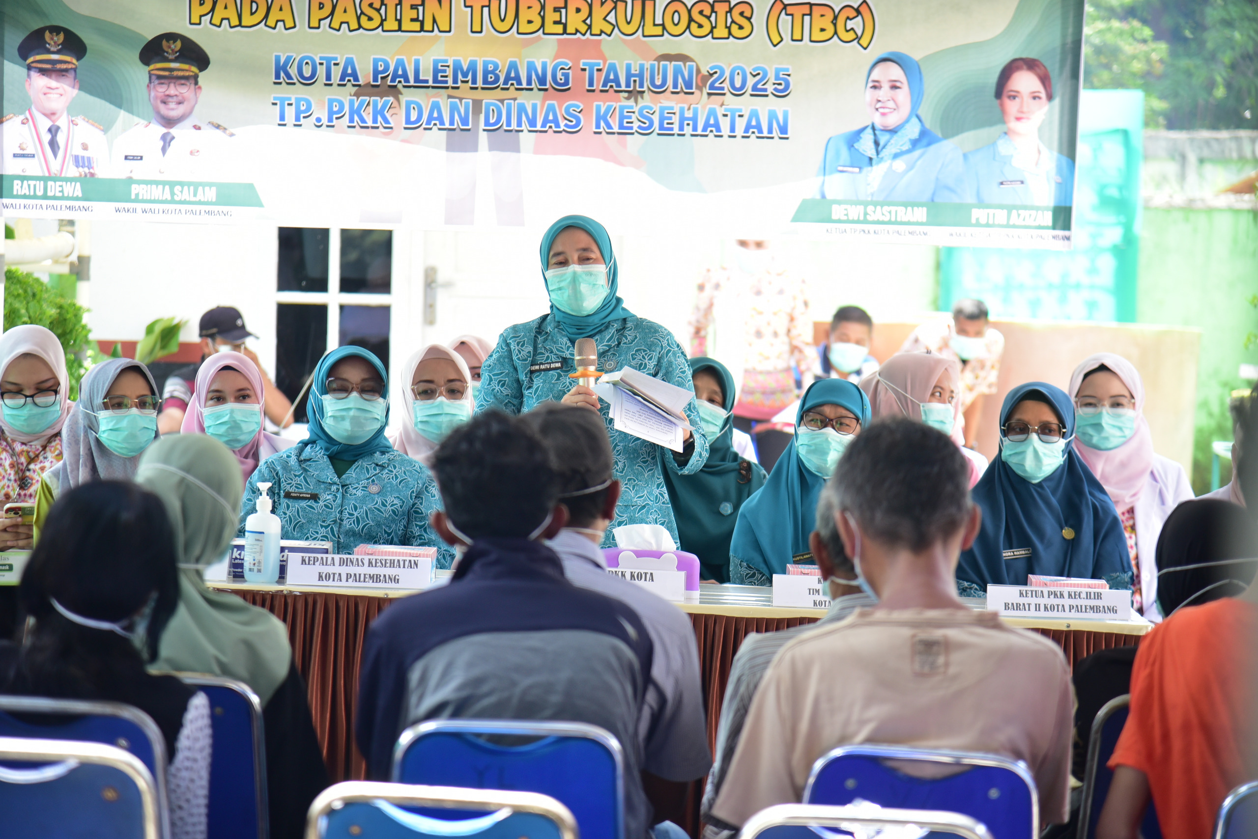 PASTIBERITA – Bekerjasama dengan Dinas Kesehatan Kota Palembang, Ketua Tim Penggerak PKK Kota Palembang, Dewi Sastrani Ratu Dewa bagikan makanan tambahan pada pasien Tuberkulosis (TBC) di Puskesmas Sematang Borang, Jumat (31/10).