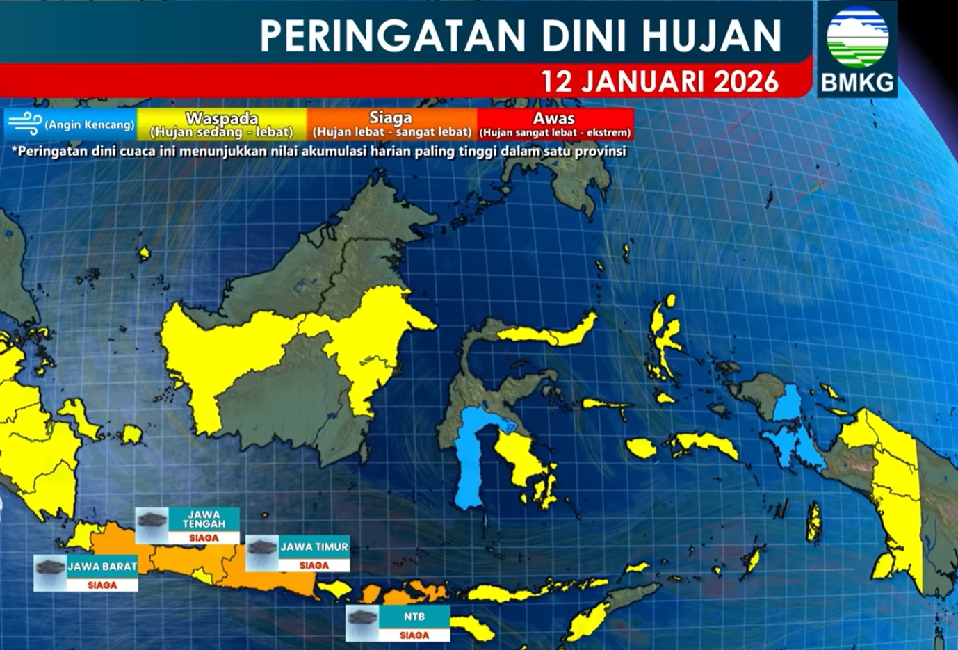 PASTIBERITA Badan Meteorologi, Klimatologi, dan Geofisika (BMKG) mengingatkan masyarakat untuk meningkatkan kewaspadaan terhadap potensi hujan lebat hingga sangat lebat yang diprakirakan terjadi di sejumlah wilayah Indonesia pada Senin, 12 Januari 2026, khususnya di Jawa Barat, Jawa Tengah, Jawa Timur, dan Nusa Tenggara Barat (NTB).